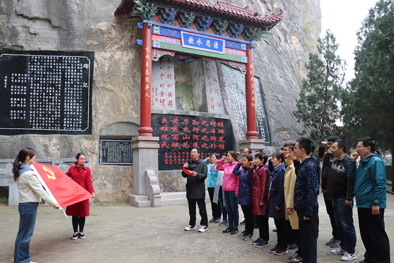 在塔岗青年洞,李延沟村支部书记李合印为大家讲述了开挖青年洞的艰难过程和现在村民的幸福生活。在“饮水思源”处,举行了重温入党誓词活动。全体党员面对鲜红党旗,举起右手庄严宣誓,表达了不忘初心坚定信念,牢记使命勇于担当,以实际行动奋发有为的信心和决心。