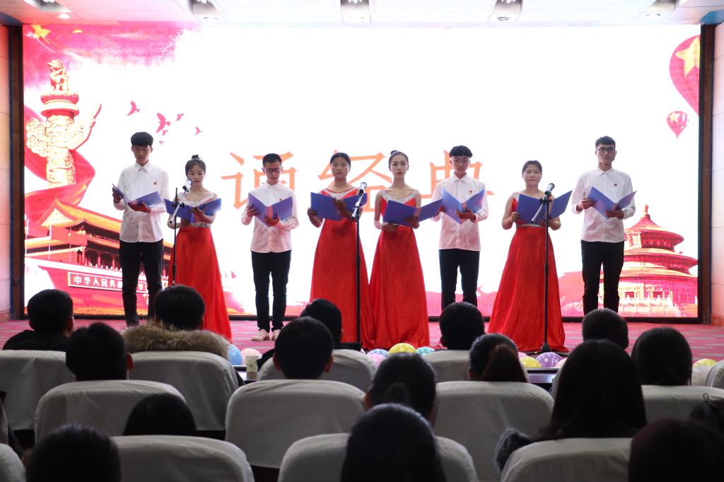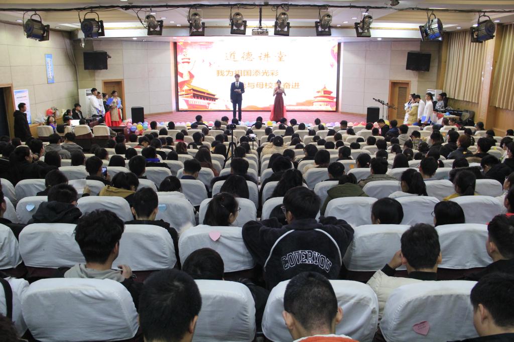 本次道德讲堂以“我为祖国添光彩,我与母校共奋进”为主题,分为“做自我反思、唱道德歌曲、看道德短片、诵道德经典、谈心灵感悟、送吉祥祝福”六个环节。与会师生自我反思“何为爱国?为何爱国?如何爱国?”,齐声高唱爱国歌曲《国家》《我和我的祖国》,观看道德短片《初心•梁家河篇》,聆听道德经典《少年中国说》《可爱的中国》,学习十九大代表茹振钢的先进事迹,畅谈心灵感悟,在“心愿墙”上写下爱国寄语。