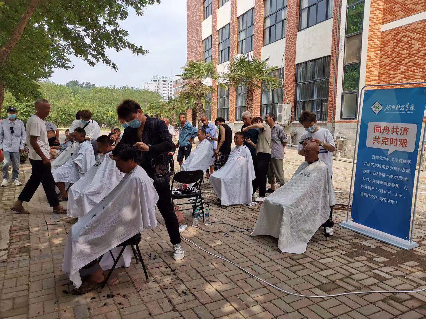 同时,学院党委积极联系红旗区艺昕美发沙龙,邀请10名爱心理发师来校,为受灾群众义务提供理发服务,在人手不够的情况下,学生志愿者也积极参与为安置群众理发、刮胡子。师生志愿者们真真切切为受灾群众着想,扎扎实实为受灾群众提供便利,他们的努力付出得到了大家的认可。