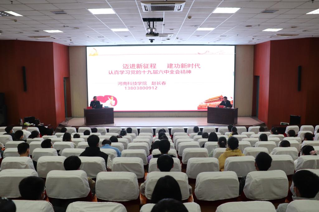 在新图书馆一楼报告厅举行“化梦领航工程”第十一期理论宣讲报告会。河南省委、新乡市委理论宣讲团成员,党校副校长、组织部副部长赵长春作宣讲报告。学院辅导员、学生党员和学生代表参加了会议。会议由院党委副书记朱宏主持。