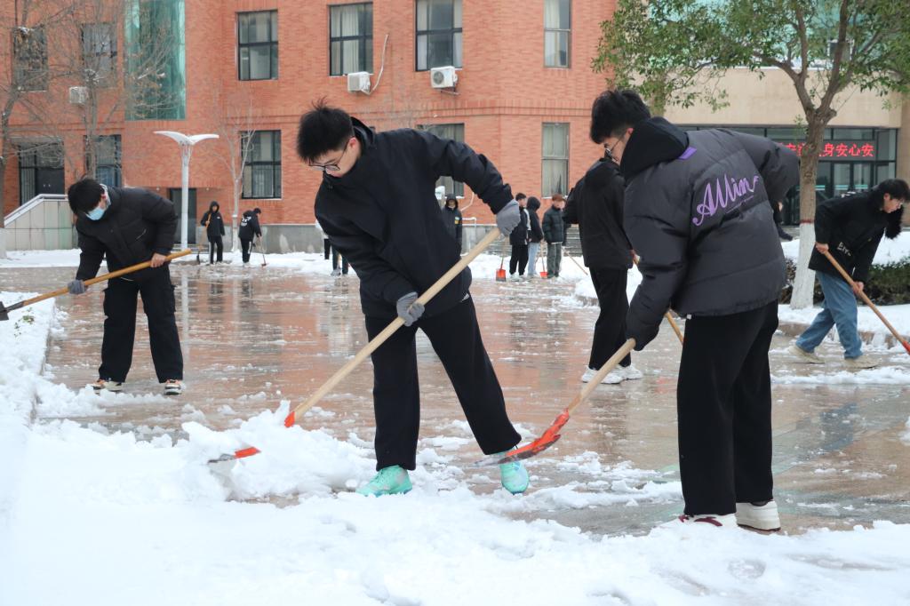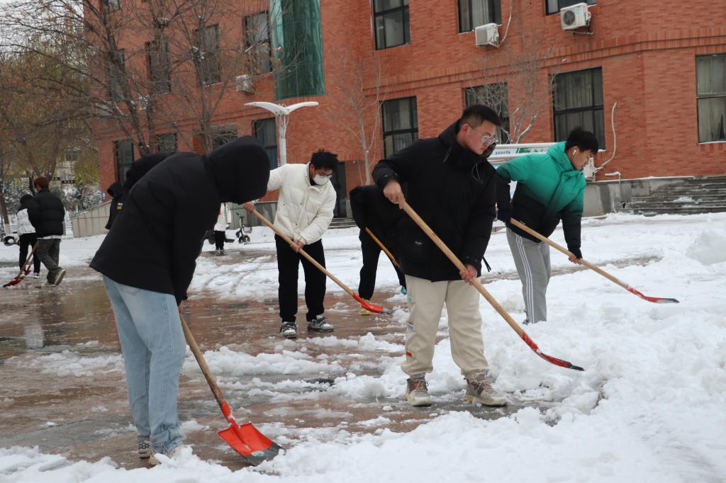 党委书记孙震寰、党委副书记谷永庆和全体辅导员积极组织扫雪除冰活动,带领学生党员和部分积极分子于学院办公楼前集合扫雪,为我校师生出行保驾护航。