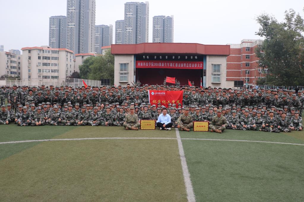 在田径场举行2024级新生军训汇报表演暨总结表彰大会,汇演在庄严的国歌声中拉开帷幕。各学院方阵按顺序依次进行军训成果汇演。