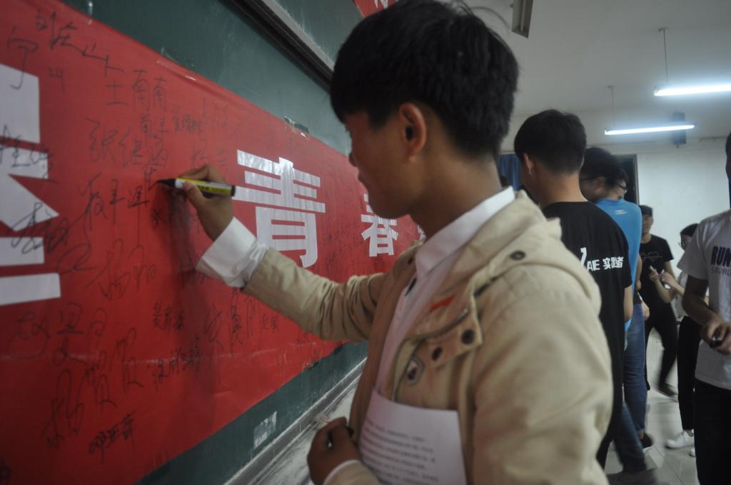 会议在庄严的《中国青年志愿者之歌》中拉开帷幕。创新实践部副部长周振兴通过PPT播放的形式详细讲解了学院青年志愿者协会的结构设置的基本情况和开展的特色活动。2016级志愿者代表王彩银和由青联纪监部部长贾六虎结合自身经历讲述了参与志愿服务的收获和感受。她的发言使现场2017级志愿者们对志愿服务工作充满向往,要大力弘扬“奉献、有爱、互助、进步”的志愿精神,用实际行动参与到各项社会服务中,回馈社会,让志愿精神薪火相传。会议最后,全体志愿者举行右手面对会旗庄严宣誓,并在条幅上郑重的签上自己的名字。