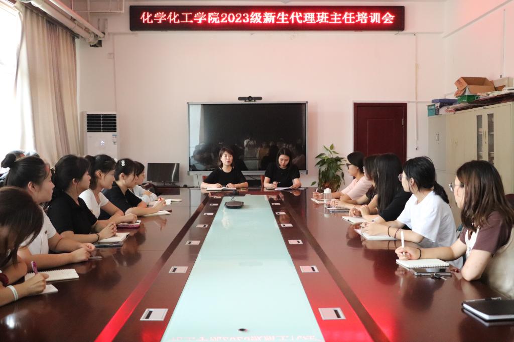 在办公室举行新生代班培训会。院团委书记王莹、2023级新生辅导员顾肖肖以及全体新生代理班主任参加了会议。