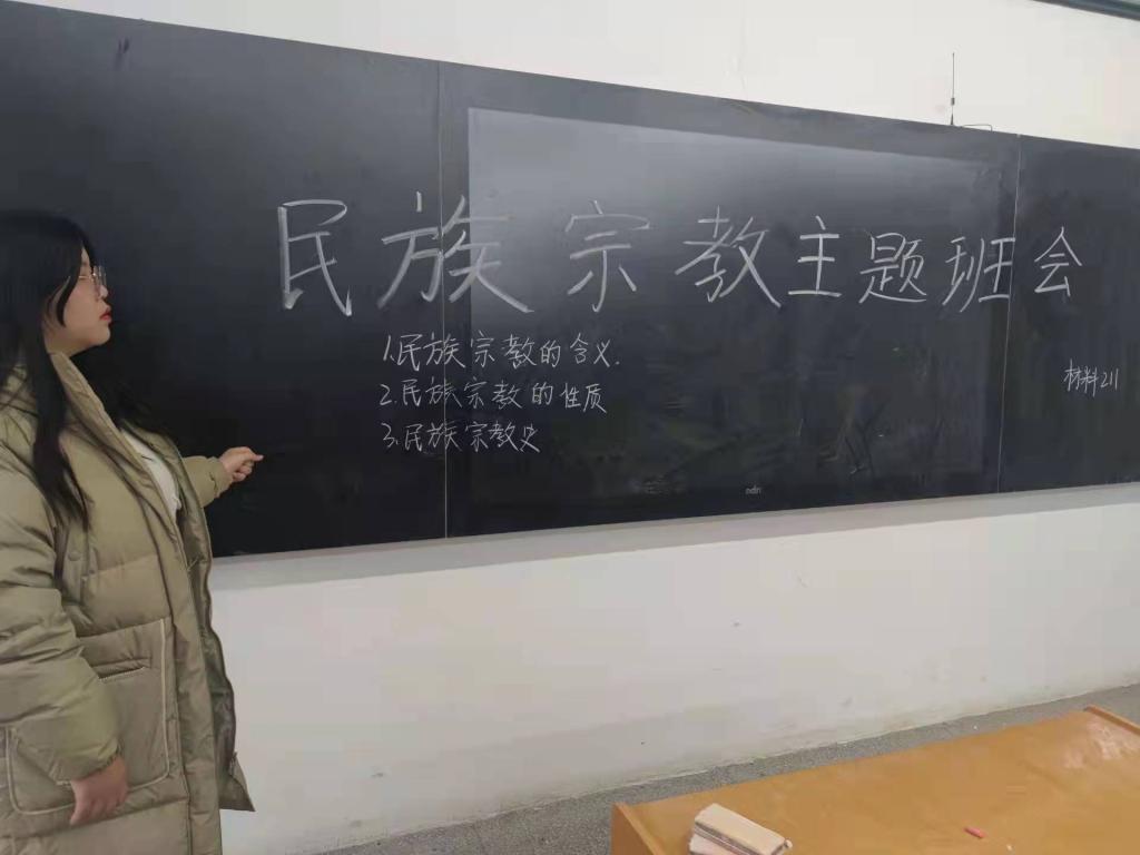 班会强调各民族文化都有自身的特色与魅力,大家要加强交流,相互尊重,相互帮助,同心协力,努力做文化交融的使者和团结进取的奋斗者,真正做到“民族团结一家亲”;各班分别从宗教政策的基本内容、宗教信仰自由政策的内涵及意义、我国宗教坚持什么原则、我国为什么实行宗教信仰自由政策等方面进行专题学习。