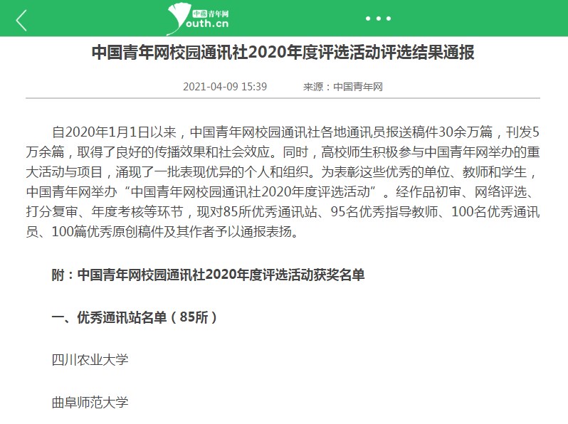 近日,由中国青年网和中共河南省宣传部、河南省教育厅分别举办的“中国青年网校园通讯社2020年度评选活动”和2020年河南省大中专学生志愿者暑期文化科技卫生“三下乡”社会实践活动优秀团队。为表彰先进、选树典型,引领广大青年学生扎根中国大地了解国情民情,通过社会实践坚定理想信念、站稳人民立场、练就过硬本领、投身强国伟业,经作品初审、网络评选、打分复试、年度考核等环节,最终对100篇优秀原创优秀稿件和优秀团队予以通报表扬。