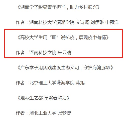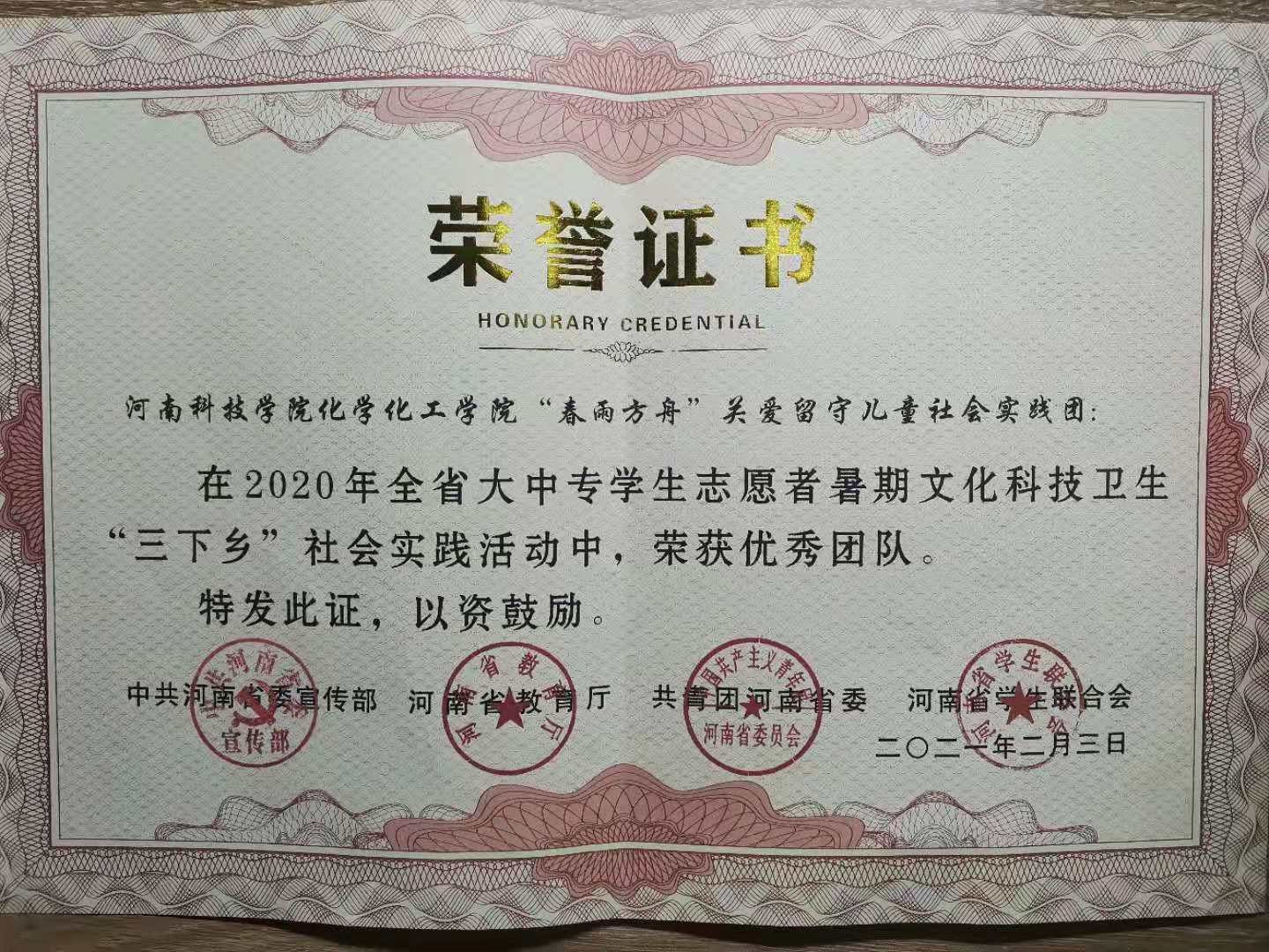 来自“党员筑梦”精准扶贫实践团队的宣传报道稿件《青春领航脱贫攻坚“党员筑梦”温暖人》,出自青春战疫帮扶,勇踏筑梦之旅实践团的宣传报道稿件《高校大学生用“画”说抗疫,展现疫中有情》,源自“春雨方舟”关爱留守儿童实践团的宣传报道稿件《河南大学生关爱留守儿童,用爱传递温暖》,分别荣获“中国青年网校园通讯社优秀稿件”。学院重点团队“春雨方舟”关爱社会实践团荣获河南省暑期“三下乡”社会实践优秀团队。