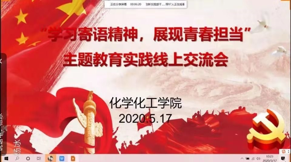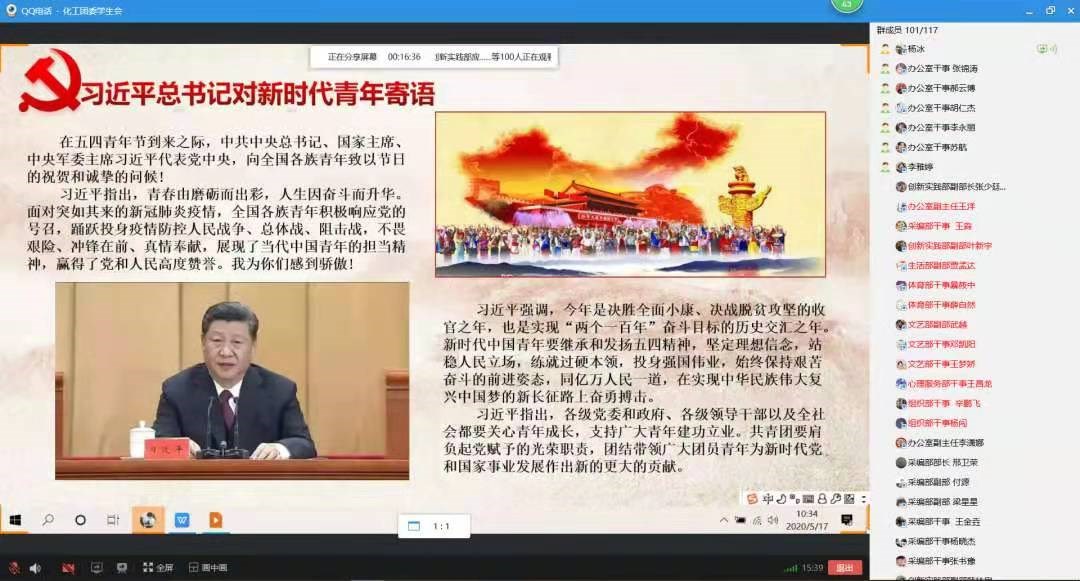 会上,以PPT和微视频的形式,全体团学干部线上集中学习习近平总书记关于五四寄语精神,深刻领会省委书记王国生对寄语的辅导要求,做到原原本本认真学、融会贯通结合学,期间结合团学工作、居家学习和抗疫防疫的亲身体会、深刻感受,围绕“五四”精神,青年的责任与担当,奋斗的青春最美丽等话题展开热烈讨论与交流。
