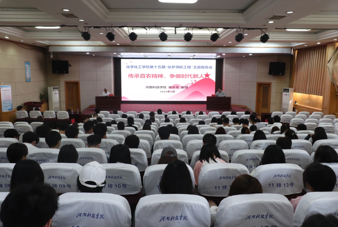在图教201举行“百农”精神暨第十五期“化梦领航工程”主题报告会。报告会邀请我校国家科技进步二等奖获得者杨永光教授主讲。学院领导班子、师生代表共计200余人参加了报告会。