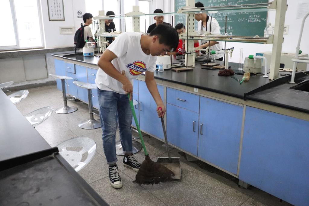 志愿者带着扫把、铲子、抹布等清理用品清扫院楼道、清理楼道堆积物、去除张贴小广告、擦拭实验室仪器灰尘。学生不怕脏、不怕累,将学院打扫的窗明几净,为教师创造一个温馨、舒适、整洁的工作环境。