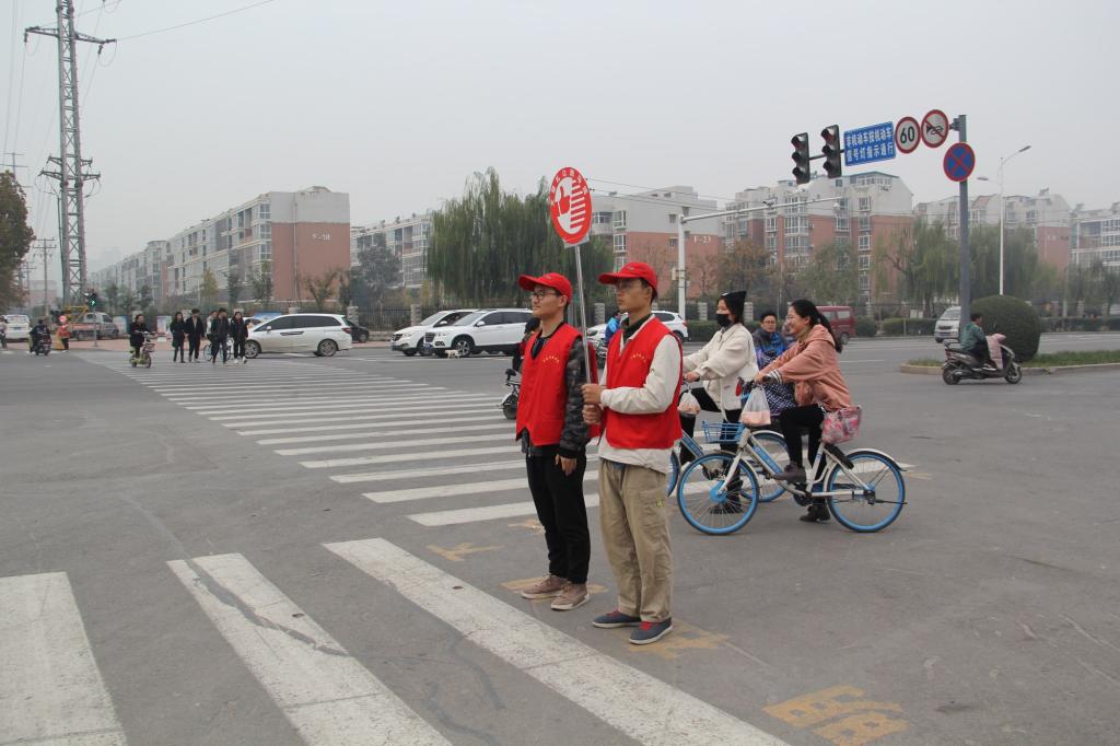 组织青年志愿者在新乡市华兰大道与新东大道交叉口开展“文明交通志愿服务”活动。