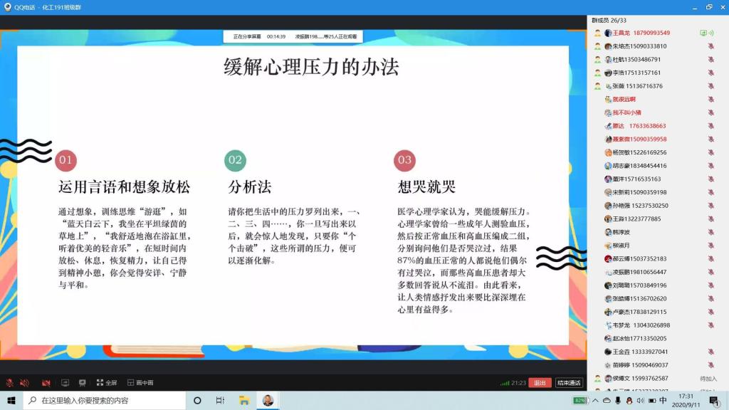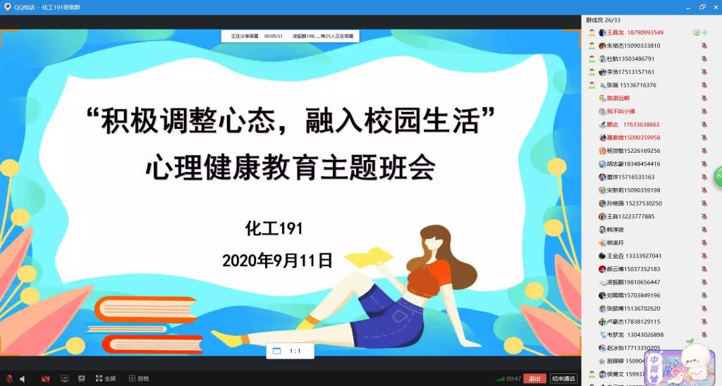 各班心理委员借助网络平台,围绕“积极调整心态,融入校园生活”这一主题,通过心理评测、交流讨论、互动游戏、观看视频等环节为学生普及心理健康知识,消除疫情带给学生的心理困扰,提升学生维护自身心理健康的意识和技能。