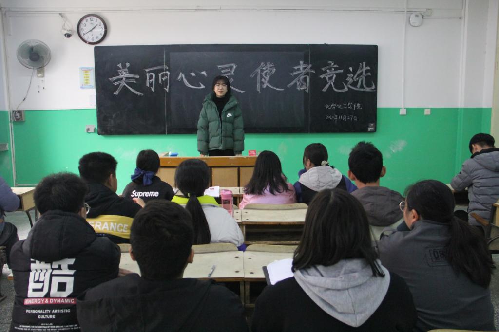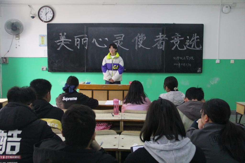 活动伊始,心理服务部部长常慧艳宣读“美丽心灵使者”评选标准,详细阐述了“心灵使者”作为心理健康教育的示范者、倾听着、陪伴者的重要性,要坚持以育心和育德相结合,不断提升学院心理健康教育工作新面貌。随后参选优秀心灵使者的学生围绕个人风采展示、班级工作概况、工作成果、个人收获、未来展望等方面展开答辩。竞选者准备充分,答辩流畅,极具感染力,在展示个人工作风采的同时也加入了个人对工作的总结反思和提升计划。最终经过激烈评选化工204班王建涛,应化201班刘畅,制药201班刘彦,化工203班刘婧,应化203班陈钰,应化203班任方楠,应化201班张敏,应化204班杨文博,荣获“最美心灵使者”。
