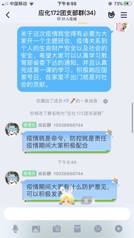 活动前期,各支部依托班级QQ群,以视频团课形式,开展《认识新冠,防患未然》疫情防控知识普及专题学习活动,学院50个团支部均圆满完成线上视频团课工作。各支部还积极推送并组织学习央视新闻、学校专题网站、化工先锋苑等新媒体平台推送的疫情防控最新情况、自我防护及心理疏导等内容。