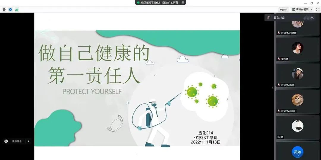 会上,各班班长向同学们介绍了近期严峻的疫情防控形势,通报了部分学生违反校园疫情管理规定情况,提醒同学们牢固树立“每个人都是自己健康的第一责任人”意识,科学、正确佩戴口罩,勤洗手,多通风,按时到指定地点参加全员核酸检测,做好个人安全防护;不要心存侥幸心理,不点外卖,不取快递,严格遵守校园疫情管理规定;认真对待网课,保持有效学习。