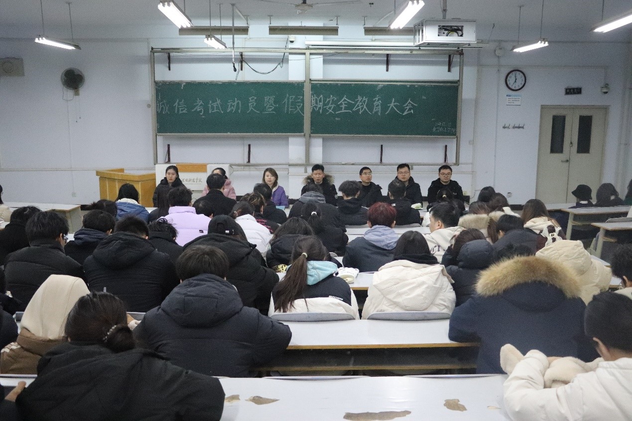 在九合二召开诚信考试动员暨假期安全教育大会。院党委副书记谷永庆、副院长张万庆、全体辅导员及各班学生代表参加此次会议。会议由团委书记王莹主持。