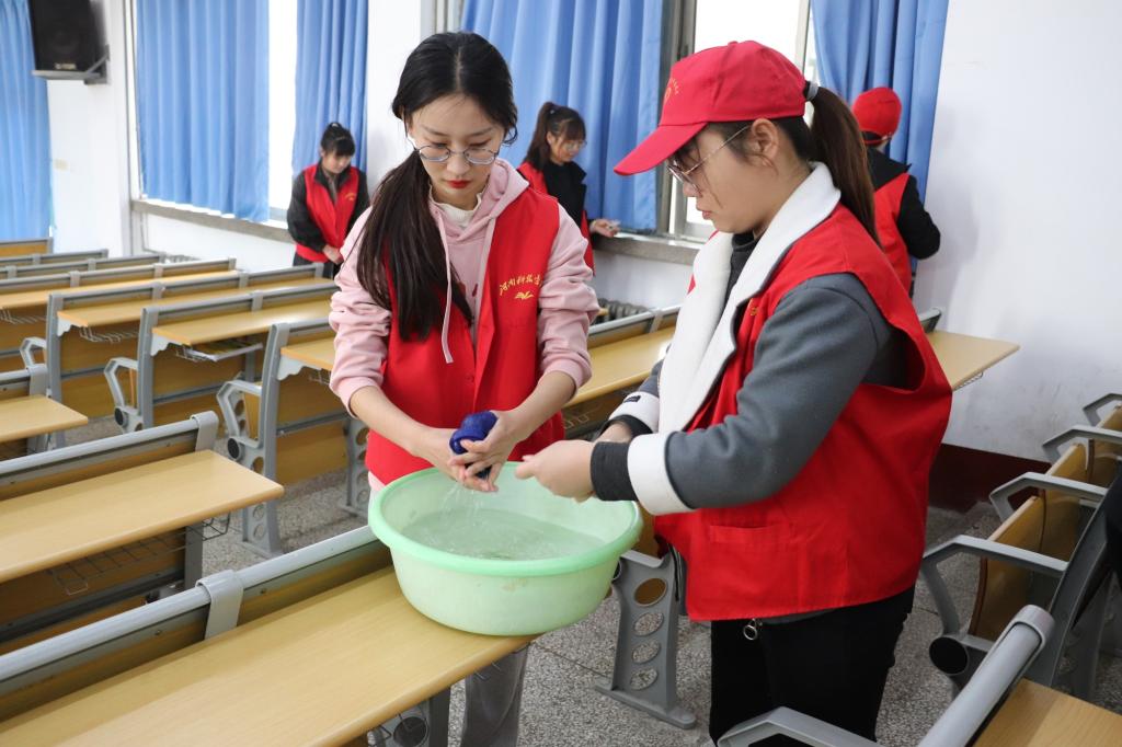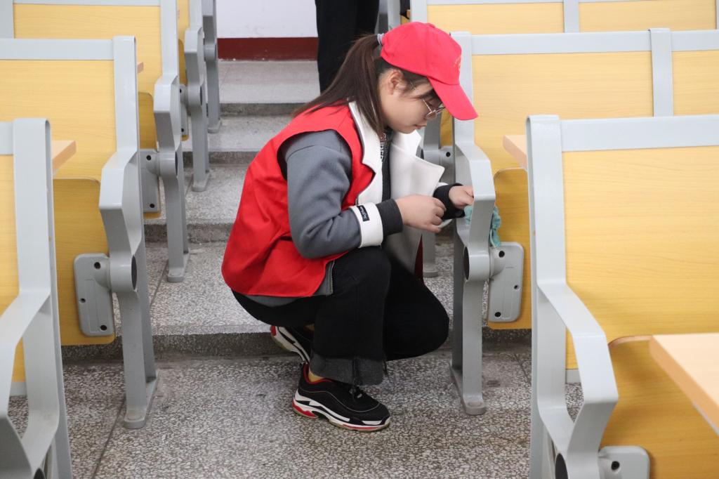 活动中,志愿者分工明确、干劲十足,清洁课桌字迹污迹,擦拭黑板窗户地面,充分发扬学生不畏脏,不怕累的精神。经过全体学生的共同努力,教室环境焕然一新、整洁明亮。志愿者提醒过往学生养成随手“捡”,随堂“清”的好习惯,共同维护干净整洁的校园环境。